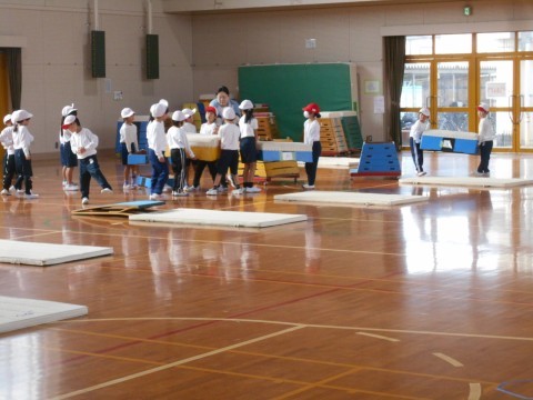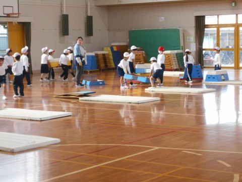 跳び箱にトライしています。準備と後片づけも子どもたちで協力して行っています。