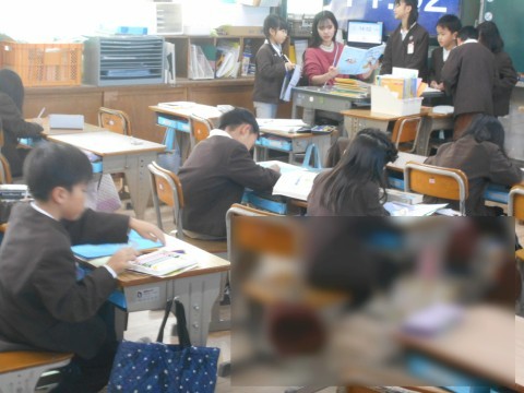 つくった絵本を先生に確認してもらっています。