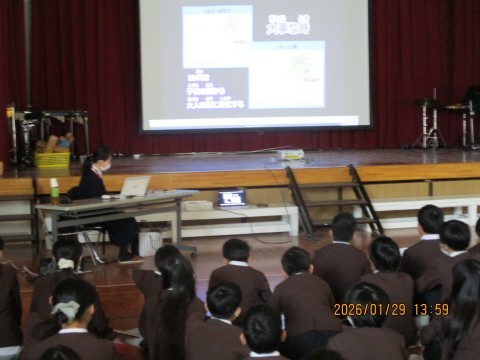 6年薬物乱用防止教室を実施しました。学校薬剤師の前谷先生より,薬物の心身への影響について,薬物の恐ろしさについて学びました。