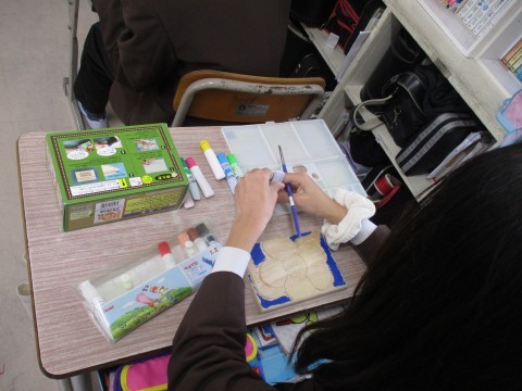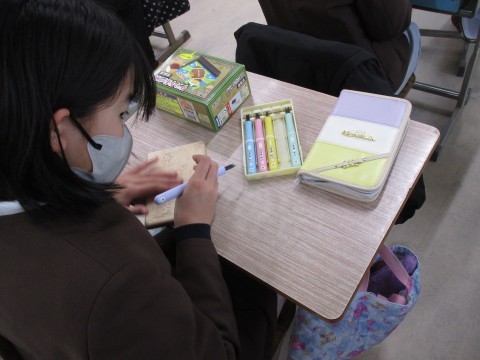 デザインをし,彫刻刀で彫り,色付けしていきます。仕上がりが楽しみですね。