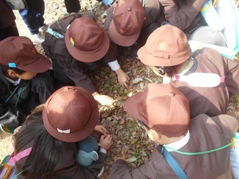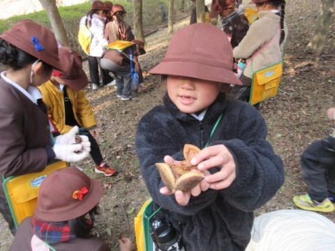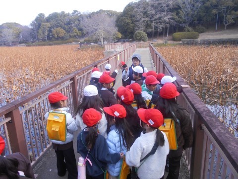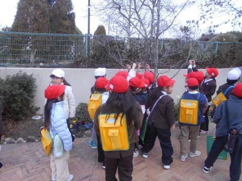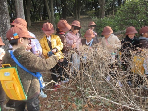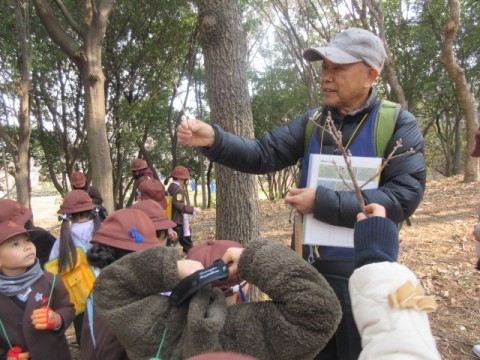 今日は,大泉緑地に冬芽観察に行きました。どんぐりの会の方々に冬の木々の様子や冬芽の違いなどを教えてもらいました。冬芽には,フワフワな毛におおわれたもの,たくさんの皮をかぶっているもの,玉ねぎのような形のもの,花芽や葉の芽がありました。また,つぶすと臭いにおいのする実,木になっている赤くておいしい実や草餅などに使われるよもぎがあることなども教えてもらいました。まだ寒いですが,梅の花が咲いていたり,ホトケノザやヒメオドリコソウなど春の花も見つけることができました。冬の間に,木や草花がさまざまな形や工夫をして寒さを乗り越え春に備えていることを知ることができました。