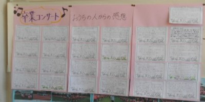 2月に行われた参観(卒業コンサート)の保護者からのお手紙を廊下に掲示しています。