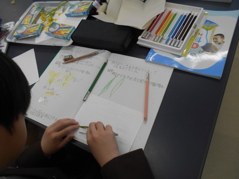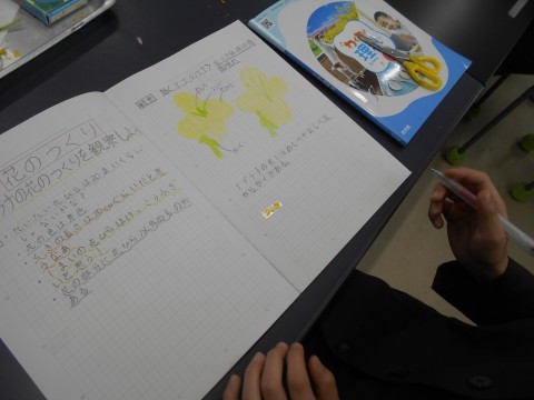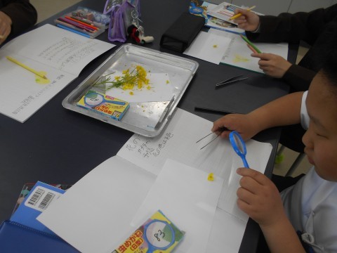 5年生の理科でアブラナの花のつくりについて学習しました。じっくりと観察し,めしべやおしべ,がくなどをみつけていました。