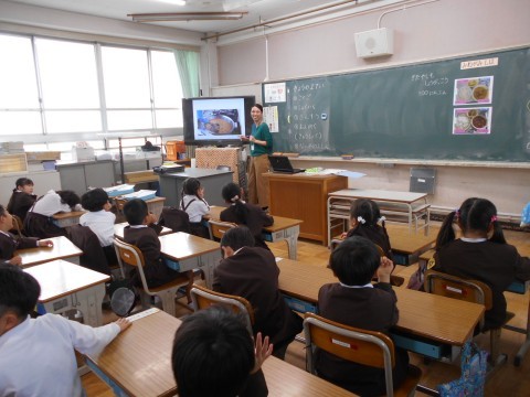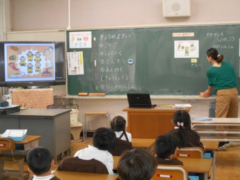 今日1年生の子どもたちは,栄養教諭の先生から給食場の仕事や食物アレルギーについてのお話を聞いたり,野菜クイズをして楽しく学ぶことができました。