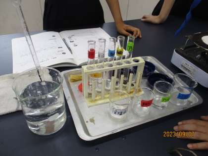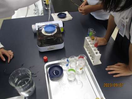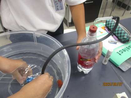 5種類の水溶液を蒸発させ、残ったものを比較した実験と、炭酸水に含まれいる気体が二酸化炭素なのかを水上置換法で調べました。