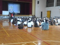 4年生は体育館で連合音楽会の発表曲を見てもらいました。
