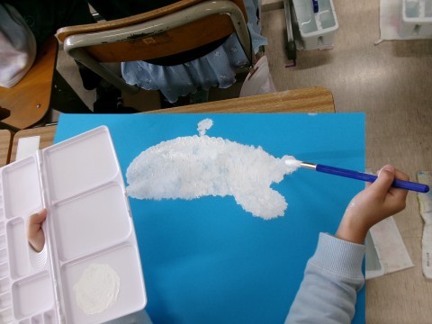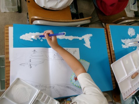 白の絵の具をたっぷり使い,筆を立てて持ち,トントン塗りをしながら雲のもこもこ具合を表現していました。
