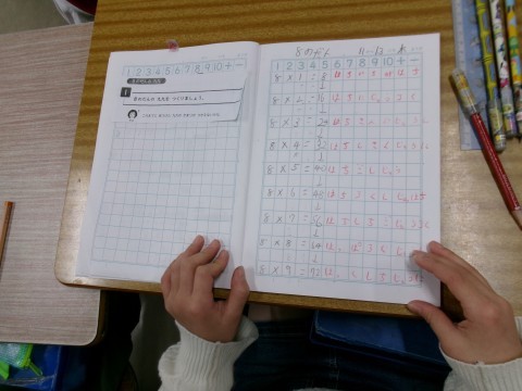 算数では,8の段に挑戦していました。暗唱する前に,唱える文を書いています。