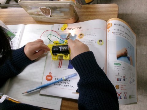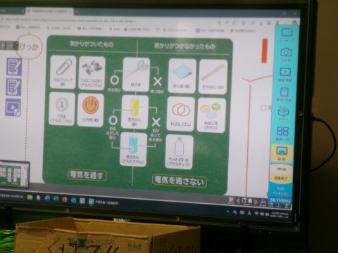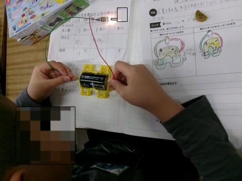 理科は,豆電球で「明かりがつくもの」と「明かりがつかないもの」について調べていました。