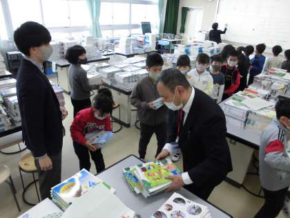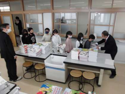 理科室に新しい教科書を受け取りに行きました。みんなで協力して,少しずつ持ちます。