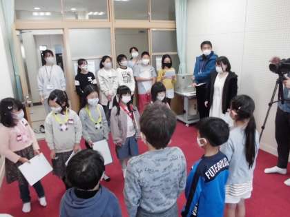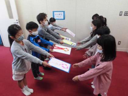 テレビ放送で,1年生のお迎え式をしました。2年生が年度末に作っていたメダルを,1年生の代表にプレゼントしました。教室で全員がもらえます。家に持ち帰ったら,一緒に喜んであげてください。