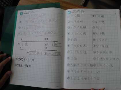 4年・算数「大きい数」 公開日 2021/04/19 更新日 2021/04/19 4年生 億や兆などの大きな数を学習します。想像できないくらい大きな数ですが,子ども達は少し得意気です。4つの数字の部屋にわけると,よくわかりますね。 写真はこちら↓ 閉じる