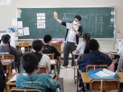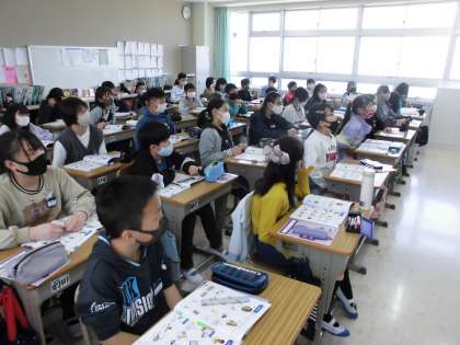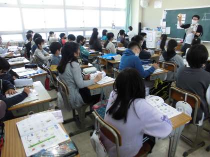 「What subjekts(sports) do you like?」の学習です。写真は,リスニング(聞き取り)ができたか,確かめているところです。