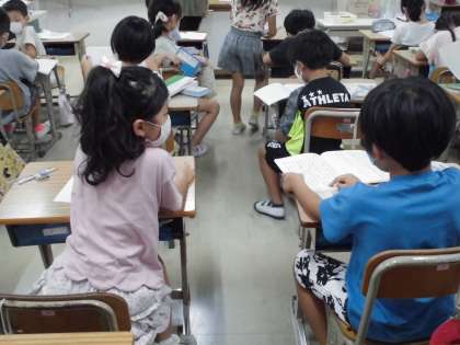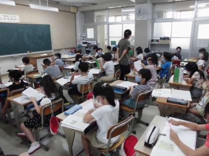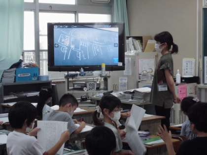 絵地図にかいてある場所への道案内を,言葉で説明する学習です。今日は,学校から公園までの道案内に挑戦しました。ノートに書いた言葉の道案内を友だちに見せて,アドバイスをもらいました。