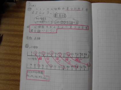 4と6の公倍数の見つけ方を考えました。いくつかの見通しの中で自分が決めた方法で自力解決し,全体交流をしながら,考えを深めていきます。