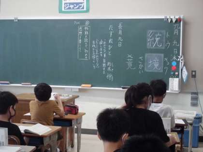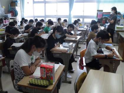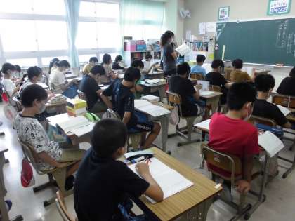 原爆の犠牲者で名前がわかっている人の遺族を探すポスターを見た,主人公の心情の変化を読み取る学習をします。写真は,初読の感想文を書くために,先生の朗読に合わせて黙読をしている様子です。