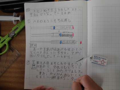 4年・理科「とじこめた空気や水」 公開日 2021/09/15 更新日 2021/09/15 4年生 今日は,閉じ込めた空気の性質を,実験で確かめました。閉じ込めた空気を押すと体積が減り手ごたえがだんだん固くなることや,押し戻す力が生じることがわかりました。 写真はこちら↓ 閉じる