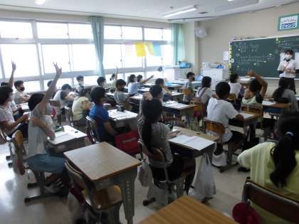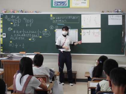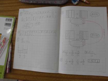 5年・算数「分数のたし算とひき算」 公開日 2021/09/15 更新日 2021/09/15 5年生 今日は,分母が異なる分数のたし算の計算のしかたを考えました。分母同士,分子同士をたしてはいけないことや,通分して分母をそろえると計算できることを,図をかいて確かめました。 写真はこちら↓ 閉じる