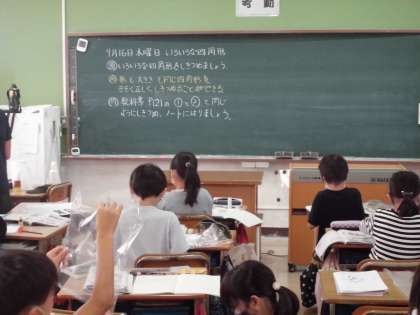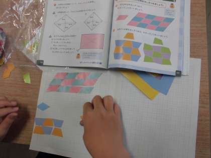 4年・算数「四角形」 公開日 2021/09/16 更新日 2021/09/16 4年生 教科書の見本を見ながら,四角形の敷き詰め問題に挑戦しました。細かな作業ですが,完成することができたでしょうか。 写真はこちら↓ 閉じる