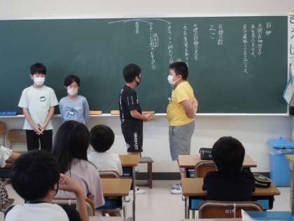 5年・学級会「今週の目標」 公開日 2021/09/27 更新日 2021/09/27 5年生 先週の学級目標の評価をしてから,今週の学級目標を話し合いました。「掃除時間の終わりまで,しっかりと掃除をしよう」「1日に3回以上,手をあげよう」の二つに決まりました。 写真はこちら↓ 閉じる