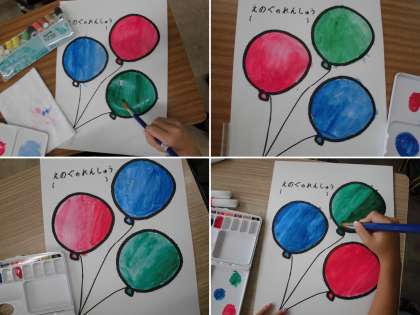 1年・図工「絵の具の練習」 公開日 2021/09/28 更新日 2021/09/28 1年生 1年生になって初めて,絵の具を使います。道具を置く場所,絵の具を入れたり伸ばしたりする場所,パレットや筆の持ち方などを教わりながら,風船に色を塗る練習をしました。楽しそうに塗っていました。 写真はこちら↓ 閉じる