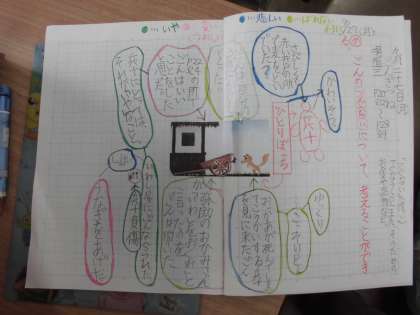 4年・国語「ごんぎつね」 公開日 2021/09/28 更新日 2021/09/28 4年生 3場面で,ごんのつぐないについて考えました。ごんの行動や心情,兵十の反応などを構造図で関連させながら,読みを深めていました。 写真はこちら↓ 閉じる