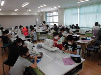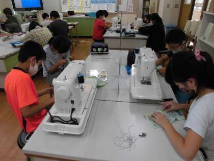 ミシンを使う練習をしています。練習布の線に沿って,丁寧に運針していきます。