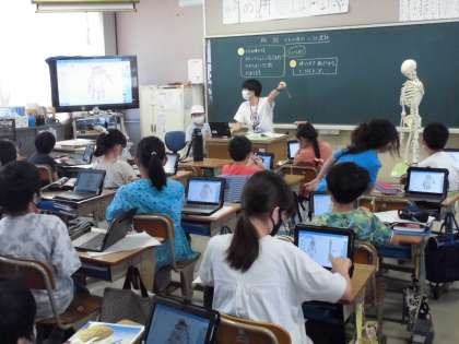 4年・理科「ヒトの体と運動」 公開日 2021/10/06 更新日 2021/10/06 4年生 手の動きについて,骨格標本や画像を見ながら,自分の手首や指の動きが曲がる仕組みを調べました。関節の部分で曲がることがわかりました。 写真はこちら↓ 閉じる