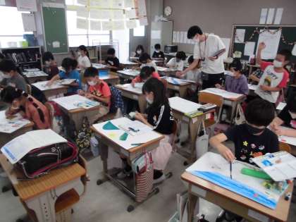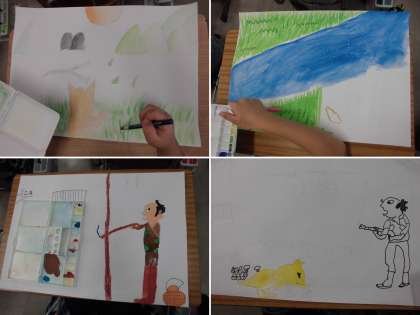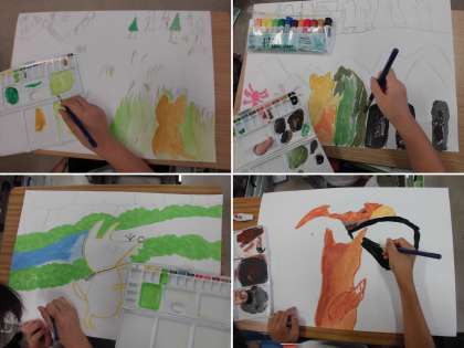 国語で学習した「ごんぎつね」の絵を描いています。印象に残った場面は,様々です。
