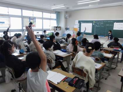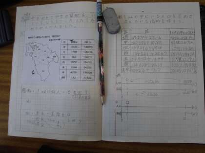 堺市の各区の人口と面積の表から,人口密度(1平方kmあたりの人数)を計算し,堺市で一番混んでいるのはどの区か調べました。人口密度の意味も話し合いました。