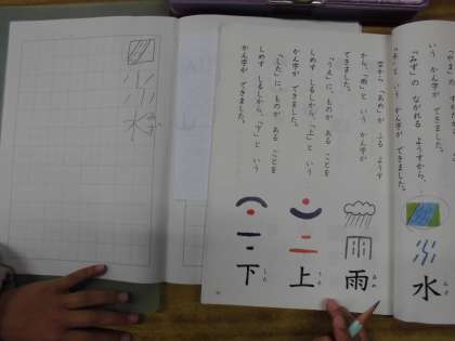 1年・国語「かん字のはなし」 公開日 2021/10/25 更新日 2021/10/25 1年生 漢字のでき方を学習しました。水の流れる様子からできた「水」,上にあることを示す「上」など,面白いでき方がありました。 写真はこちら↓ 閉じる