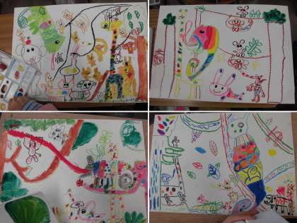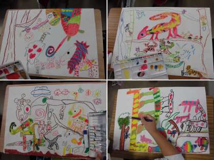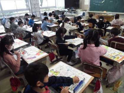2年・図工「お話の絵」 公開日 2021/10/25 更新日 2021/10/25 2年生 2年生は,「ぼくはカメレオン」というお話の絵を描いています。カメレオンの色や森の中の様子を想像しながら描いていました。 写真はこちら↓ 閉じる