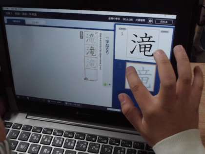 先生前で九九を暗唱するテストをしました。順番を待つ間,タブレットでドリルパークの問題に挑戦します。