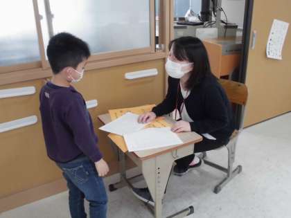 先生からお話を聞きながら通知表を受け取ったり,春休みの生活について話を聞いたりしました。