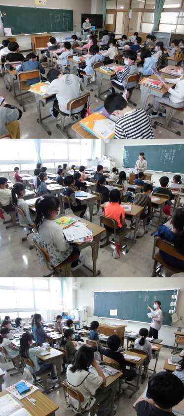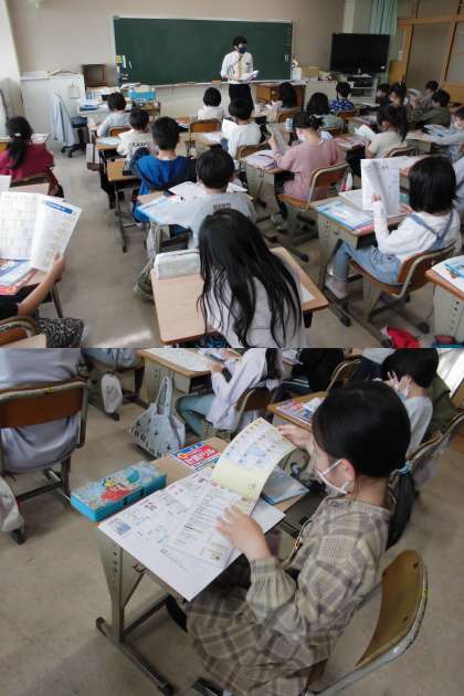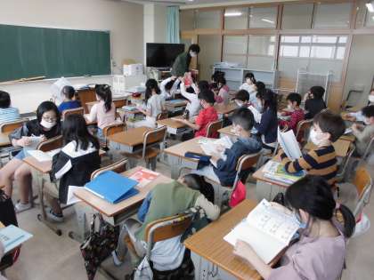 算数や国語などのノートを配ってもらっています。漢字ドリルを配ってもらったら、どんな漢字を学習するのか気になるようで、中身を見ている姿も見えます。楽しみですね。