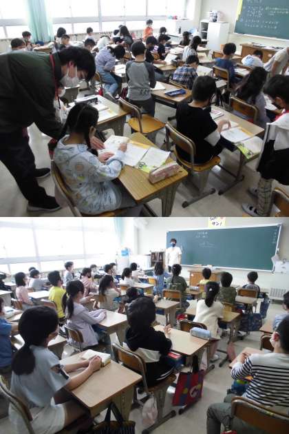 算数の授業でかけ算の学習の準備をしています。日常的にありそうな、ゲームの得点を求める活動に楽しみながら取り組んでいます。友だちの発表を聞く姿勢や態度を担任の先生からほめてもらっています。頑張っています!