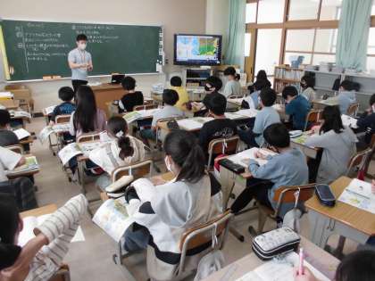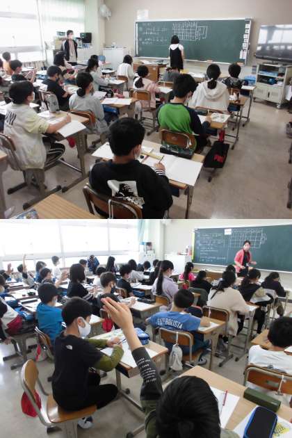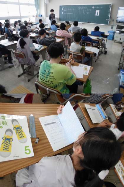 算数の授業で数の仕組みについて考えています。前のページを見返している子どももいます。今までに学習したこととの違いを意識しながら学習するのはいいことですね。