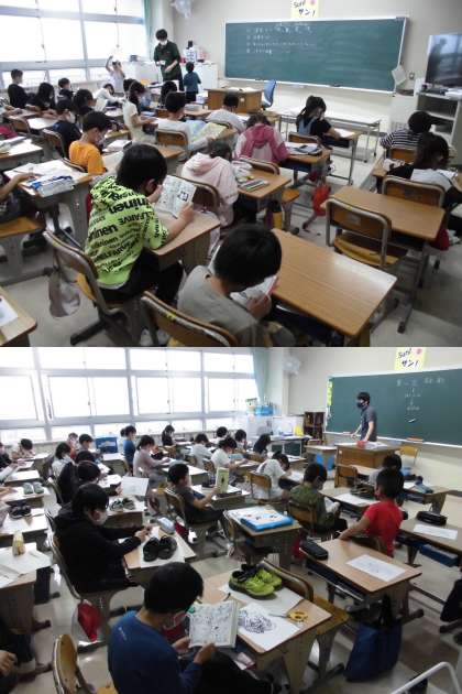 はとぶえに応募する絵を書いています。はやめに終わった子どもは、それぞれ自分の課題に取り組んだり、読書をして静かに過ごせています。