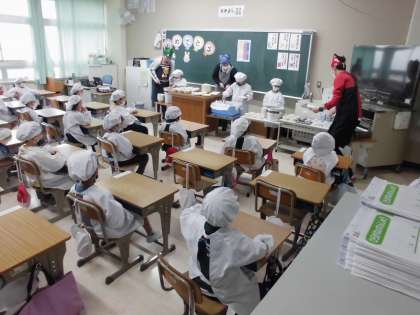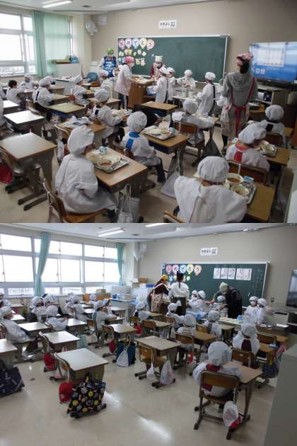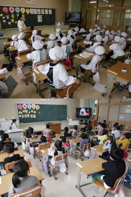 給食の準備のお話を聞きながら、説明のビデオを見て予習しています。