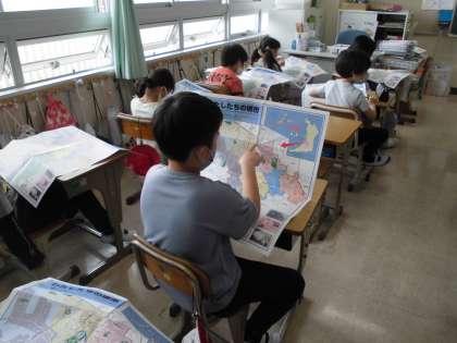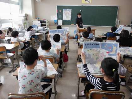 社会科の授業で、「わたしたちのまち堺」についている堺市の地図を見ながら、気づいたことや疑問に思ったことについて話しています。