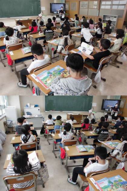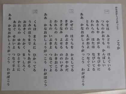 校歌を聞いています。少し聞いただけで、すぐに歌えるようになっているので、担任の先生も大喜びしています。