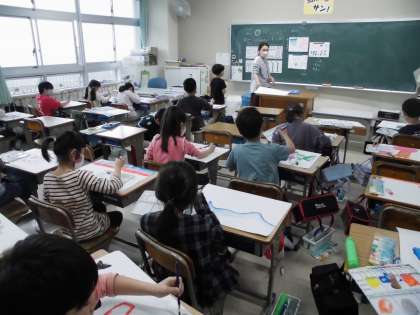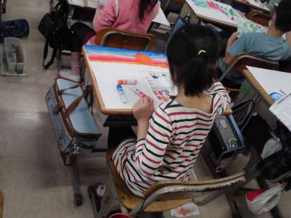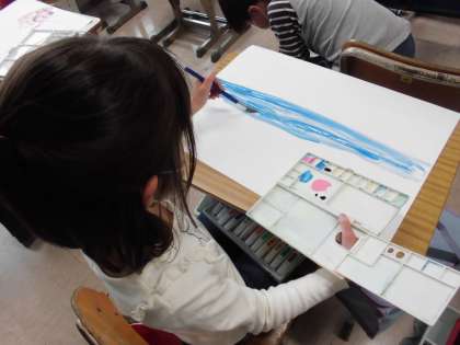 水のりょうを調整しながら、きれいなグラデーションを作っています。絵のテーマは自由なので、好きな絵を描いています。