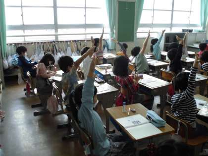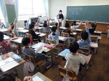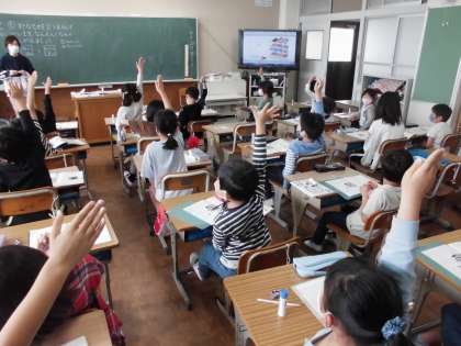 算数の授業で、教科書の挿絵を見ながら2けたのたし算のしかたの学習に取り組んでいます。