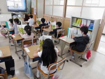 みんなで声を合わせて「はなのみち」を読んでいます。