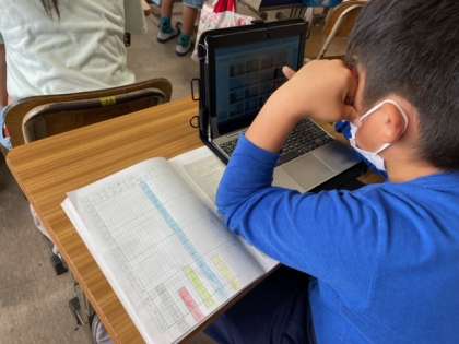 今日は、完成したグラフをタブレットで写真を撮り、みんなで見合いっこをしました。「マイクラめっちゃ人気!!」や「体育好きな人多い!」と言い、大いに盛り上がりました。