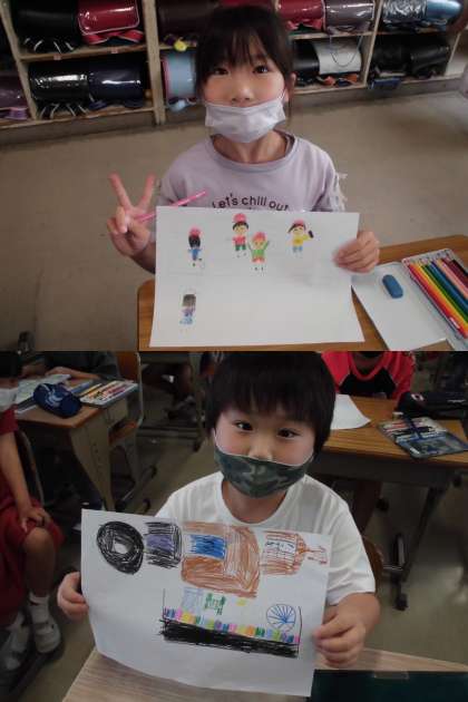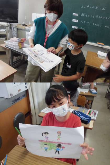 遠足の思い出の絵をかいています。裏には、説明を書いています。