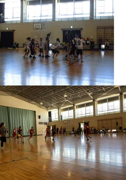 体育館では、ポートボールのチームが他の小学校のチームと試合をしていました。