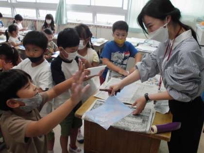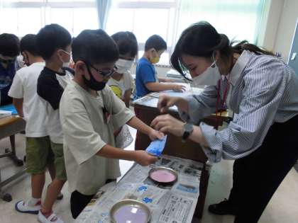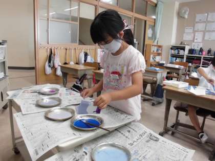 あじさいを作るといっても、紙をちぎったり、染めたりしながら、偶然にできあがる色合いを利用してつくるあじさいです。