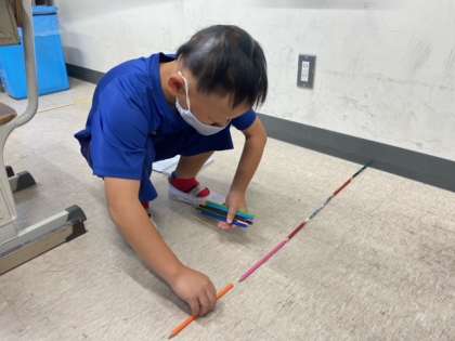 また、教科書や鉛筆などに関しては、一人では揃えれないので、「みんな!ちょっと手伝って!!」と声をかけ、協力し合って測る姿が見られました。