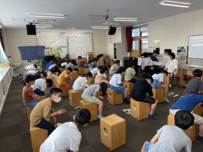 授業の最後には、カホンという楽器で演奏をしました。自分たちが座っていたイスが楽器になるとは思っておらず、とても驚きを感じていました。
